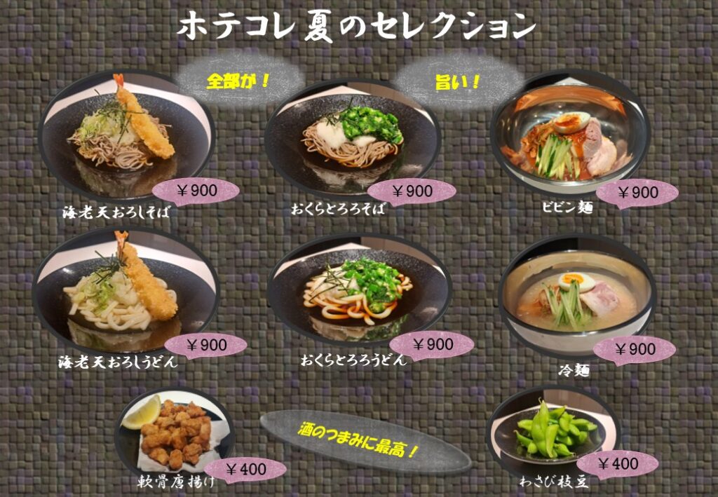 暑い季節にぴったりの冷たい麺類と、キンと冷えたドリンクと相性抜群なお酒のつまみメニューをご用意しました。